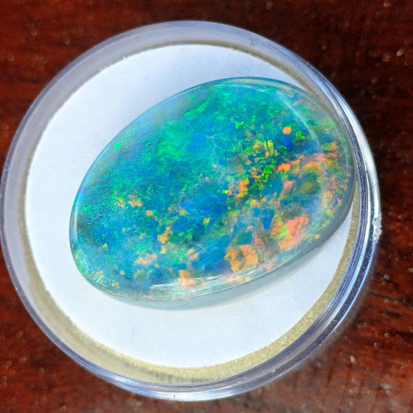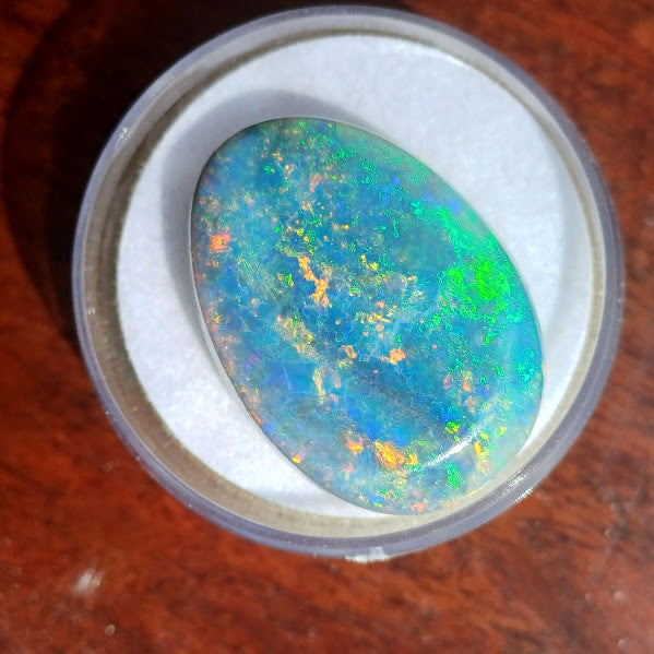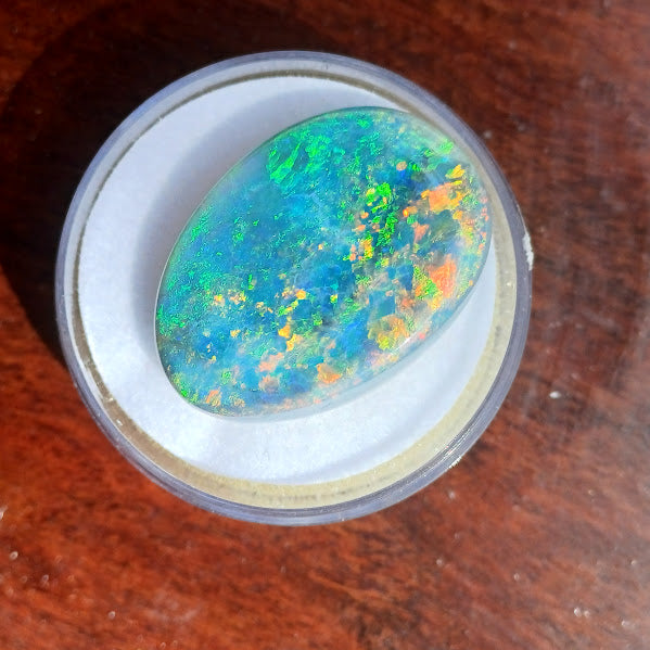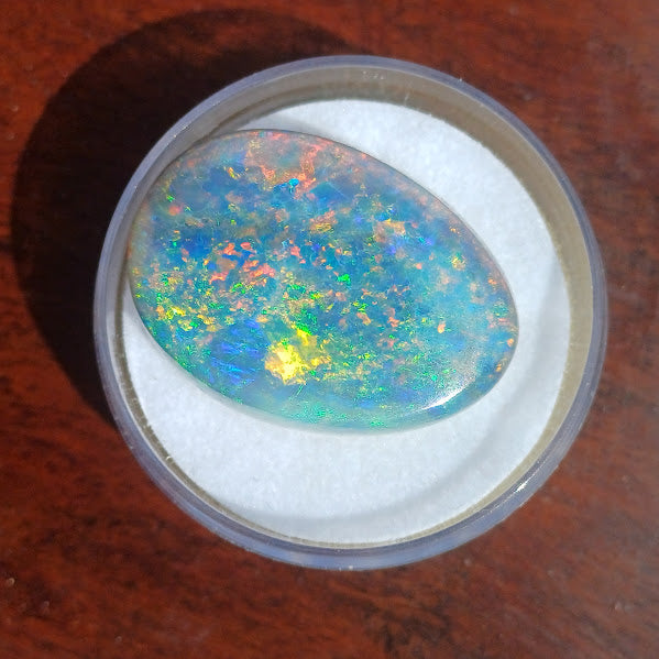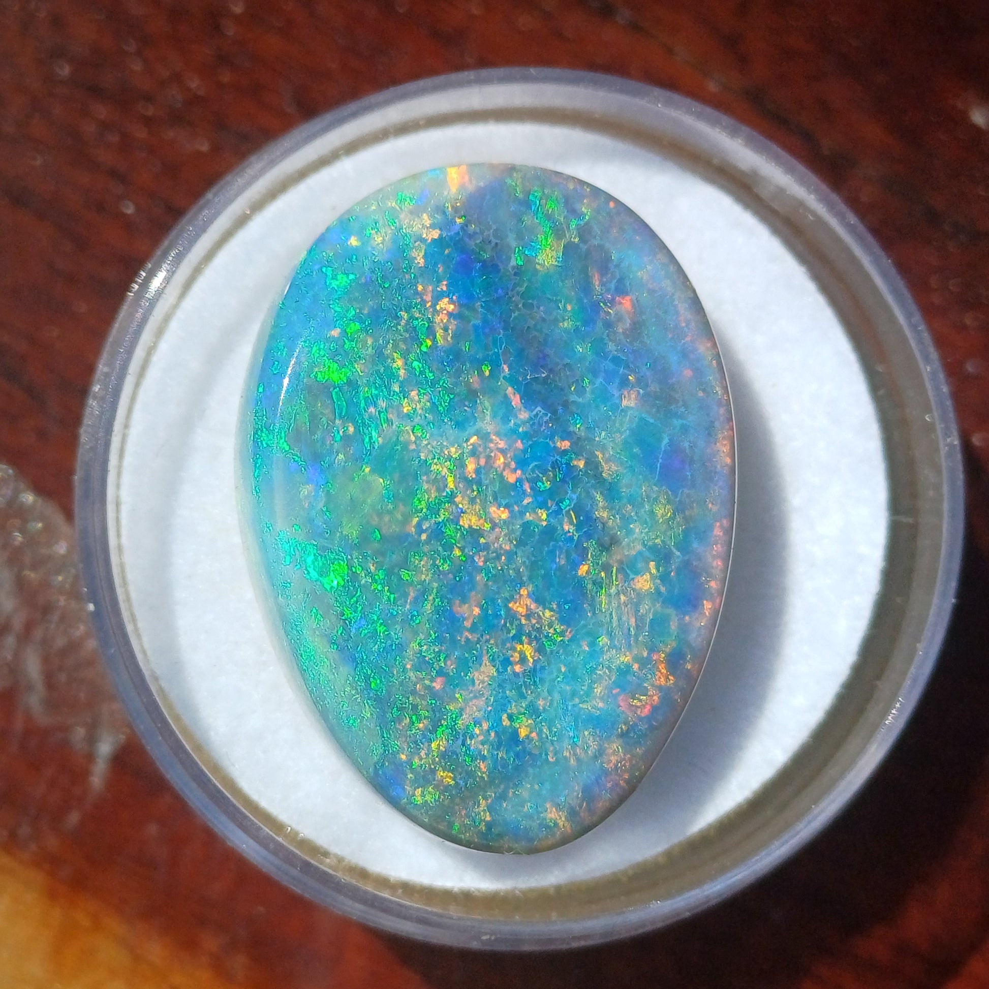 This natural solid dark opal hails from the renowned Coober Pedy region in Australia. Weighing 18.19 carats, it displays an enchanting array of colours, with flashes of yellow, green, orange, and blue. The opal features a pinfire pattern, adding to its allure and making it a striking and unique gemstone. Its dark base colour accentuates the vibrant hues, creating a mesmerising visual effect that would be perfect for a distinctive piece of jewellery.